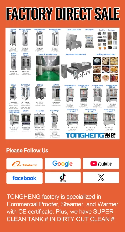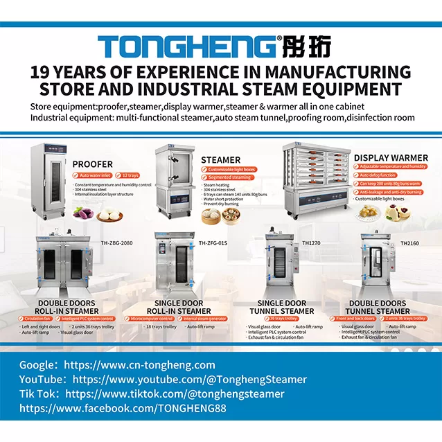 TONGHENG’S self-developed & manufactured products include: large industrial fermentation room, steaming room, disinfection room, proofer cabinet, bun steamer, display warmer, cake steamer and seafood steamer. We also providing customers with catering equipment OEM/ODM services and commercial kitchens, food factory new installation, renovation works, with one-stop services from project planning, design, manufacture, installation, equipment testing and technical training.
